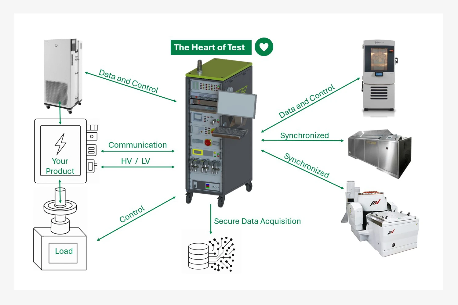 Mit unseren modularen Test-Racks „Heart of Test“ steht eine Plattform für die Validierung komplexer Komponenten mit HV- und LV-Versorgung, Sicherheitsfunktionen und BUS-Schnittstellen (CAN, LIN, SENT) zur Verfügung. Das System ist mit externen Geräten wie Klimakammern, Flüssigkeitskonditionierern usw. kombinier- und erweiterbar.