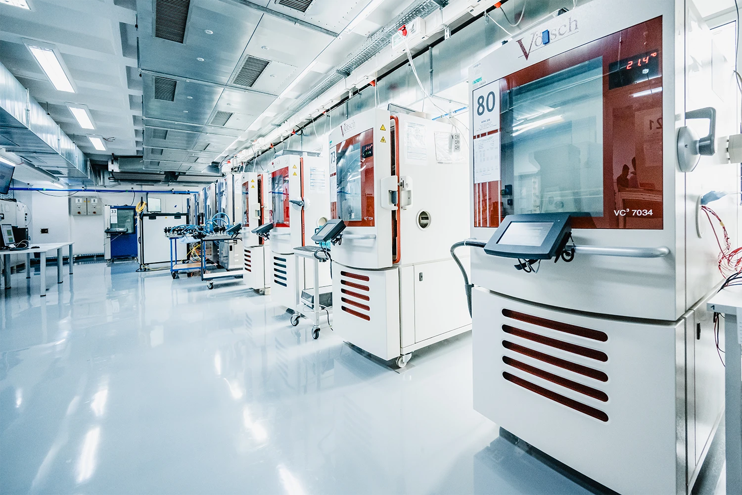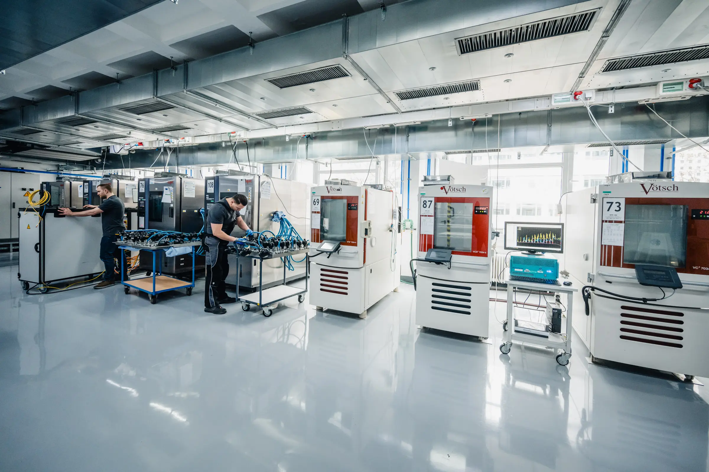 - Moderne Prüftechnik, z. B. Klimakammer, Vibrationsprüfstand, Hochspannungssysteme